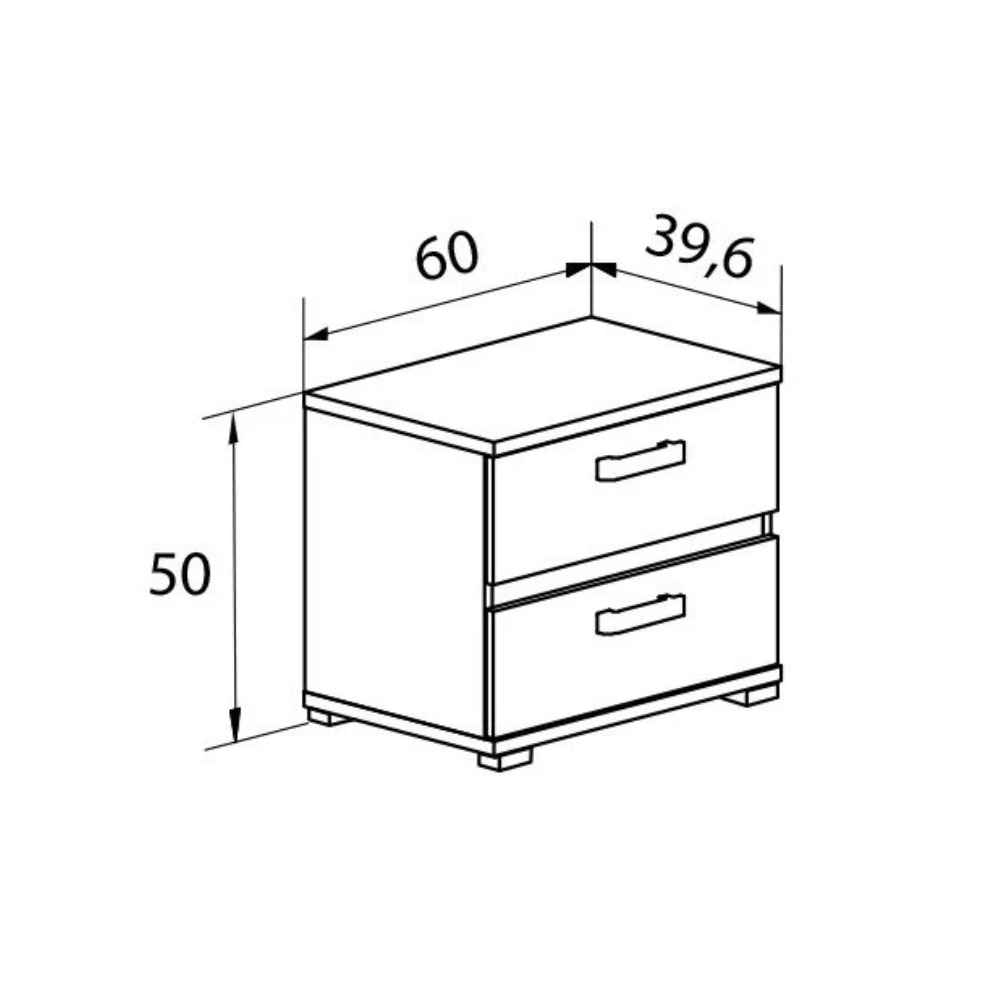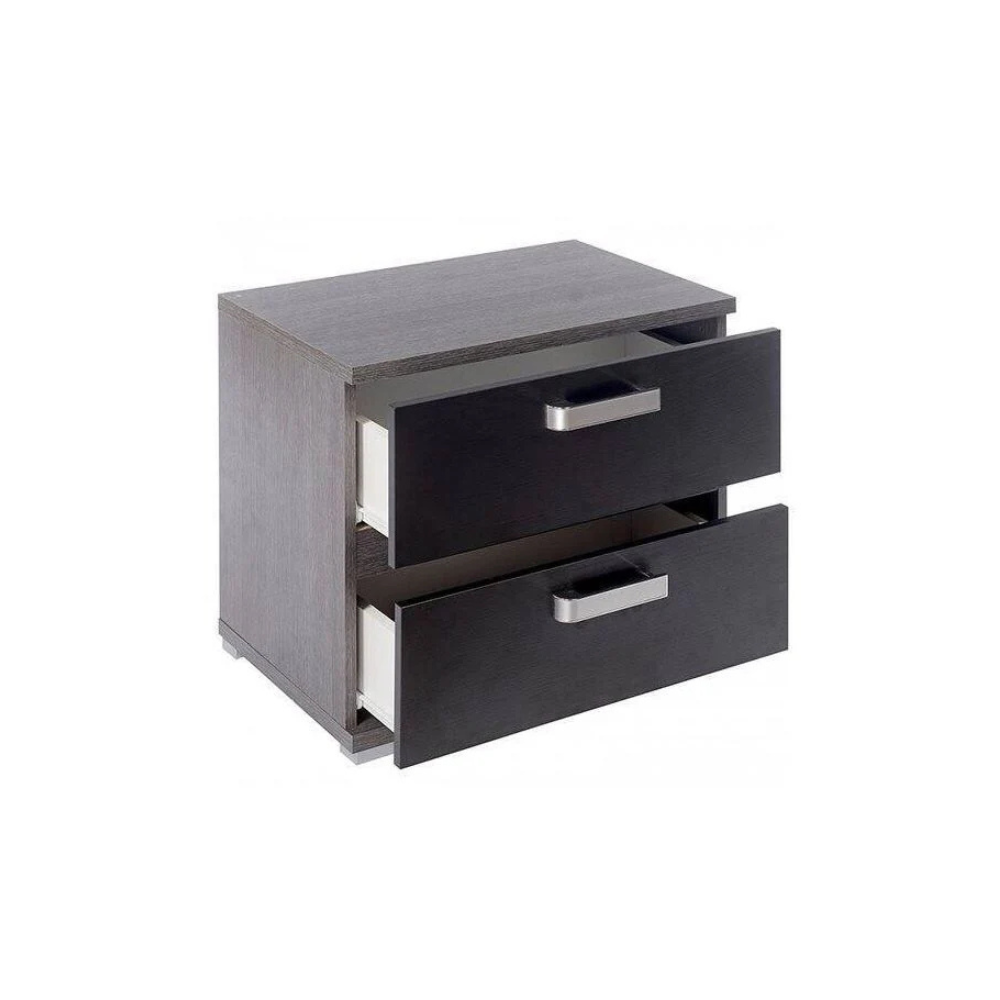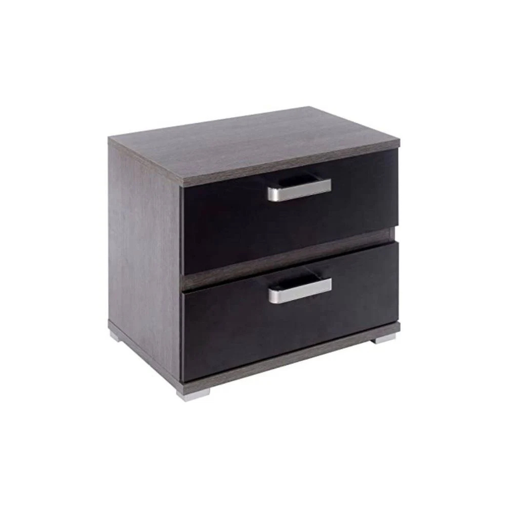Añada elegancia y practicidad a su dormitorio con la mesilla de noche Rambla. Su elegante diseño en negro ceniza crea un acento moderno, mientras que sus dos espaciosos cajones te permiten tener todo lo que necesitas al alcance de la mano. Fabricada en melamina de alta calidad y complementada con robustos herrajes metálicos, esta mesilla de noche será una solución elegante y funcional para su espacio.