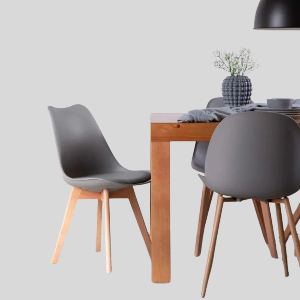 La silla Fina blanco está fabricada en resina sintética con tapizado de poliuretano. Las patas son de madera maciza de pino, el acabado es gris, impermeable