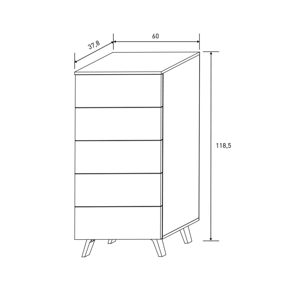 Sinfonier Soto es una combinación de elegancia y practicidad. Sus cinco amplios cajones sobre estilizadas patas crean un aspecto sofisticado, mientras que el color pino-roble de Andersen añade sofisticación.